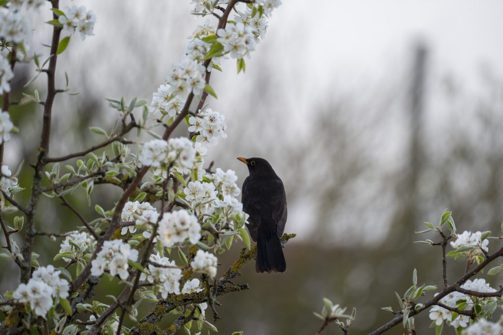 Ik denk dat ik niet al te veel hoef te zeggen, een merel die zingt/fluit zittende tussen de bloesem van de perenboom. Dat geeft het echte voorjaarsgevoel. Wat is Gods Schepping toch prachtig, vanuit een kale winterboom een boom vol prachtige witte bloesem. Een merel die je heel de winter niet hoort en dan het hoogste lied zingt, daar word je toch blij van.